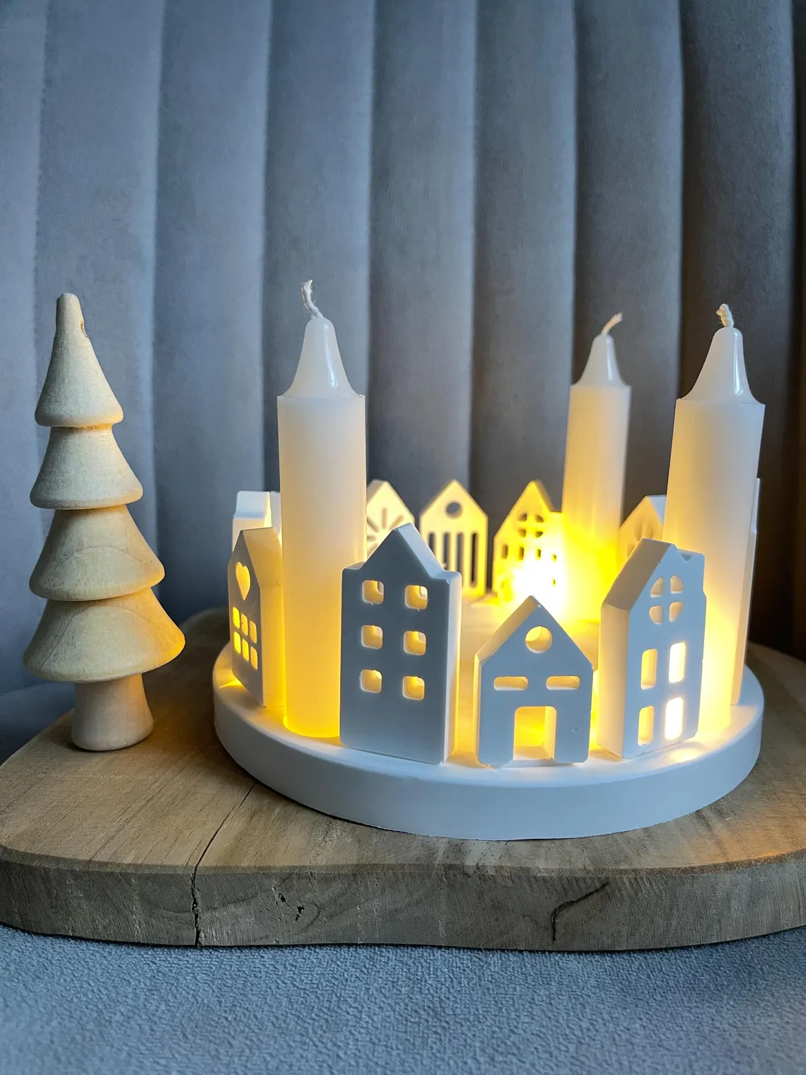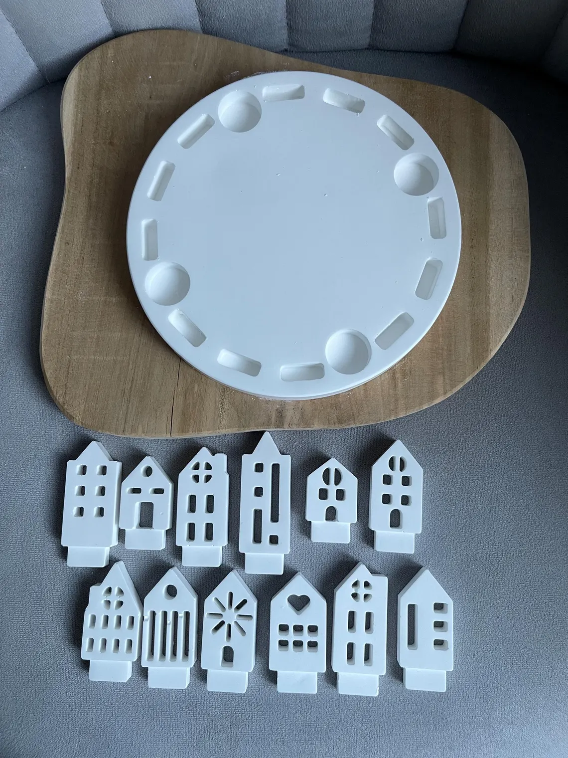 Simple, minimalist decorative plate with 12 small houses and space for 4 taper candles (Ø 22 mm).
